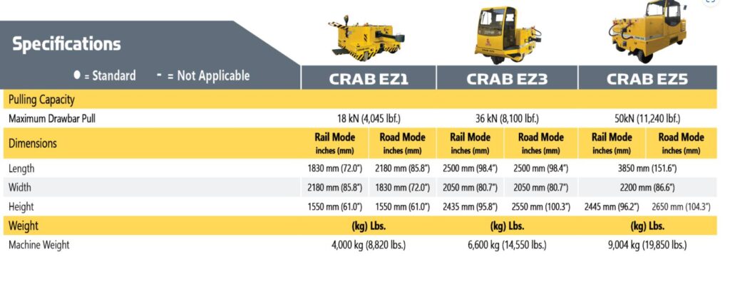 Lokomotívy Zephir CRAB EZ patria medzi najľahšie a najkompaktnejšie riešenia cesta-železnica dostupné na trhu. S nosnosťou pojazdu od 300 do 1 040 ton ponúka táto čisto elektrická rada pokročilé funkcie diaľkového ovládania, ktoré zabezpečujú maximálnu bezpečnosť obsluhy a šetrnosť k životnému prostrediu.